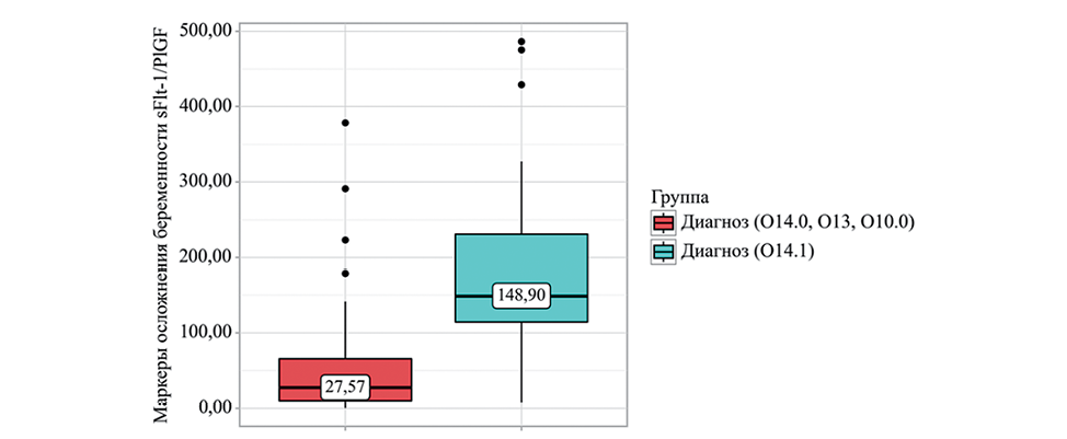 Среди биохимических маркеров пренатального скрининга 1 триместра только ХГЧ имел статистически значимые отличия между группами исследования. При этом соотношение уровня ангиогенного фактора к фактору роста плаценты (sFlt-1/PlGF) показала существенный рост показателя в группе с тяжелой ПЭ и его статистически значимые отличия (p<0,001*) от показателей у пациенток с диагнозами О14.0, О13, O10.0 (рисунок 3).