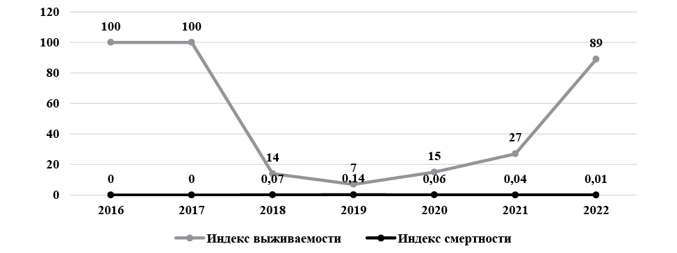 Figure 2. Dynamics of the survival and mortality index in the Khanty-Mansi Autonomous Okrug
